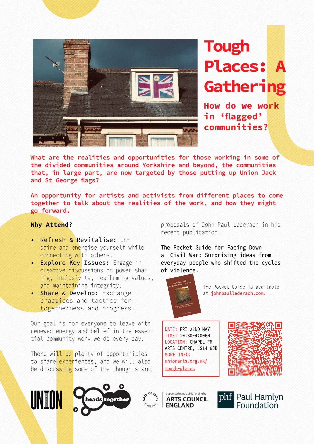 The next event in the series is Tough Places in Leeds on the 22nd May. This event asks what the realities and opportunities are for those working in some of the divided communities around Yorkshire and beyond, the communities that, in large part, are now targeted by those putting up Union Jack and St George flags?